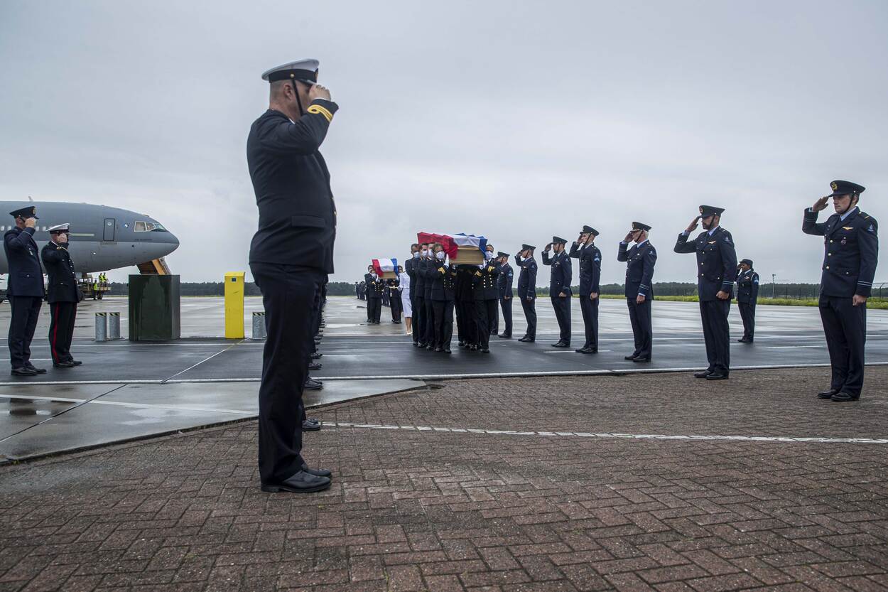 Na aankomst op Eindhoven vond er een korte ceremonie plaats in aanwezigheid van nabestaanden, defensieminister Ank Bijleveld, staatssecretaris Barbara Visser, CDS LTADM Rob Bauer en Commandant Zeestrijdkrachten VADM Rob Kramer. Daarna zijn de lichamen van Christine en Erwin overgedragen aan de nabestaanden. (Foto: SGT Cinthia Nijssen)