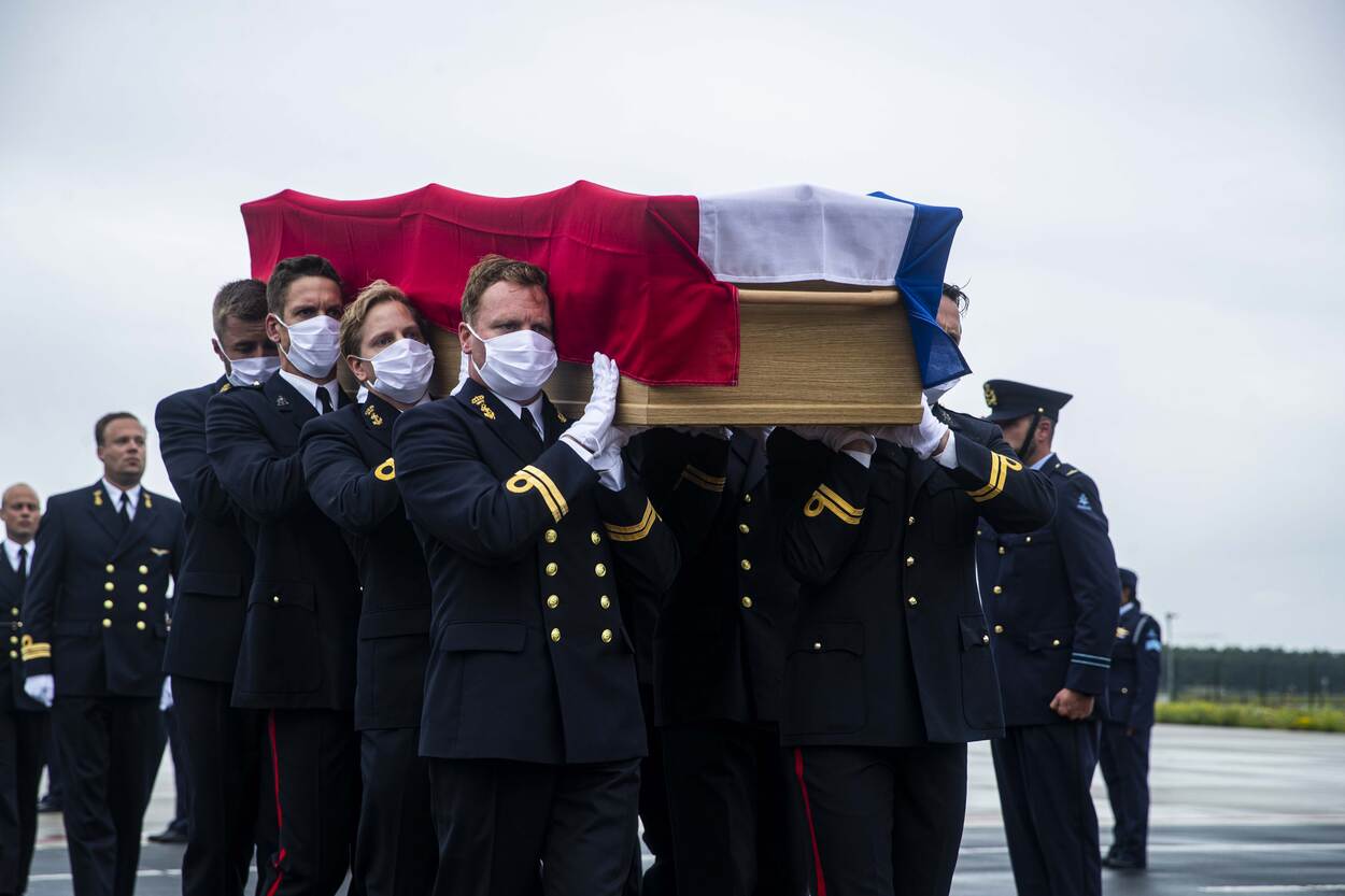 Een draagploeg met 1 van de lichamen op Vliegbasis Eindhoven. Directe collega’s droegen de kisten op de schouders vanaf het KDC-10-transportvliegtuig. Militairen van de Koninklijke Marine en de Koninklijke Luchtmacht vormden een erehaag. (Foto: SGT Cinthia Nijssen)