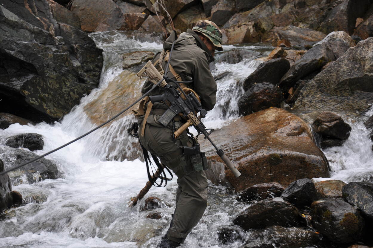 2. Deze ervaringen pasten de mannen toe tijdens de Mountain Warfare Training. Daarin een veelvoud van operaties binnen een tactisch scenario. Tot de proeve van bekwaamheid behoorde bijvoorbeeld een vertical assault, lees: werken op hoogte in extreem terrein en abseilen met uitrusting. Verder was er een survival, inclusief ‘ongeplande’ overnachting, met minimale middelen. Uiteraard ontbrak ook de rivieroversteek niet, door middel van een overspanning met touwen.