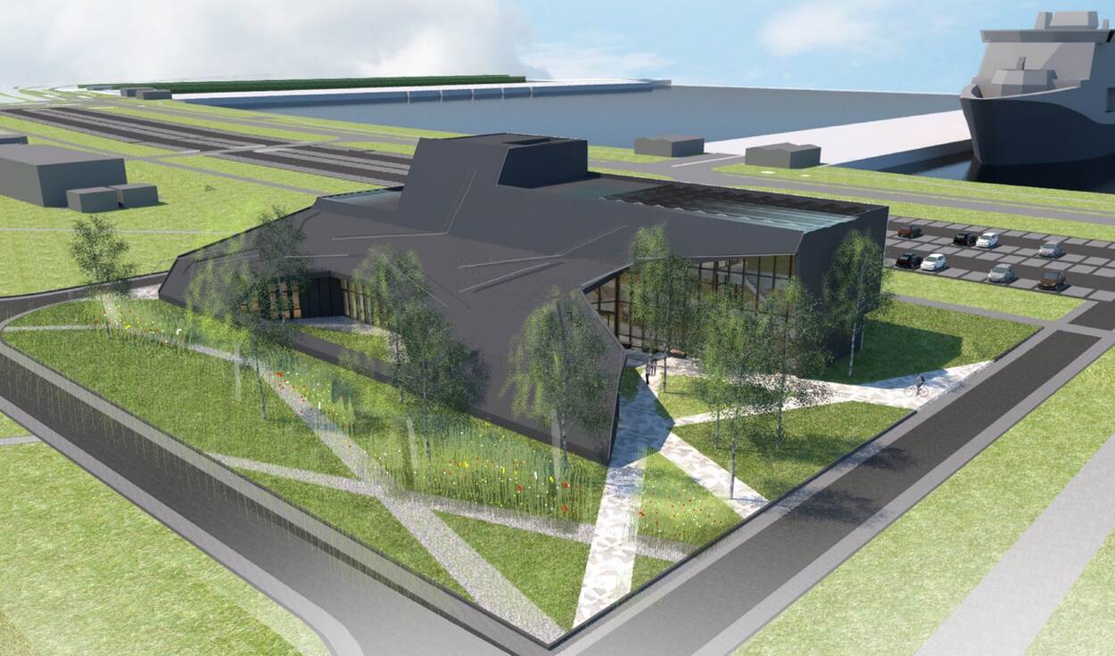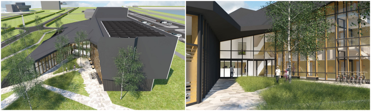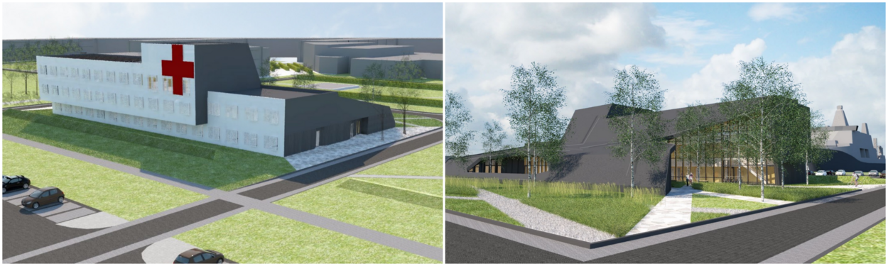 Het nieuwe gezondheidscentrum, gezien vanaf de havenzijde, is van ver herkenbaar door het grote Kruis van Genève. Aan de andere kant komt de hoofdingang, uitkijkend over een parkachtige omgeving. (Bron: GeO Architecten)