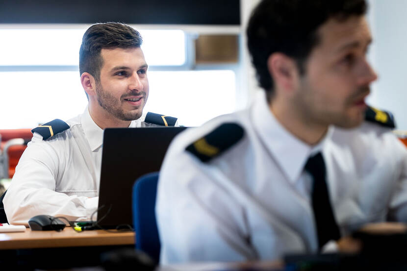 Dat laatste klinkt goed, in het Engels. Een taal die vaker uitkomst zou kunnen bieden, merkt Ramboer op. “Gezamenlijk onderwijs van Nederlanders, Vlamingen en Walen is een uitdaging. Of je zou de Engelse taal moeten gebruiken. Uiteindelijk werken we toch op hetzelfde schip. Zeker in noodsituaties moeten taalverschillen niet voor verwarring zorgen. Om dat op te lossen, werken we nu aan een virtual classroom. Dat er bijvoorbeeld in het Nederlands les wordt gegeven, maar dat dat simultaan naar het Frans wordt vertaald en andersom. Ook voor de opleidingen van de Koninklijke Marine Technische Opleidingen (KMTO) in Den Helder zou dat uitkomst bieden. De Franstalige leerlingen moeten zich nu nog behelpen met Franse handleidingen.”