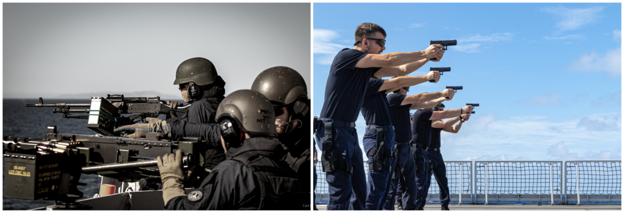 Tussen de bedrijven door beoefent de bemanning de force protection en schieten met de Glock.