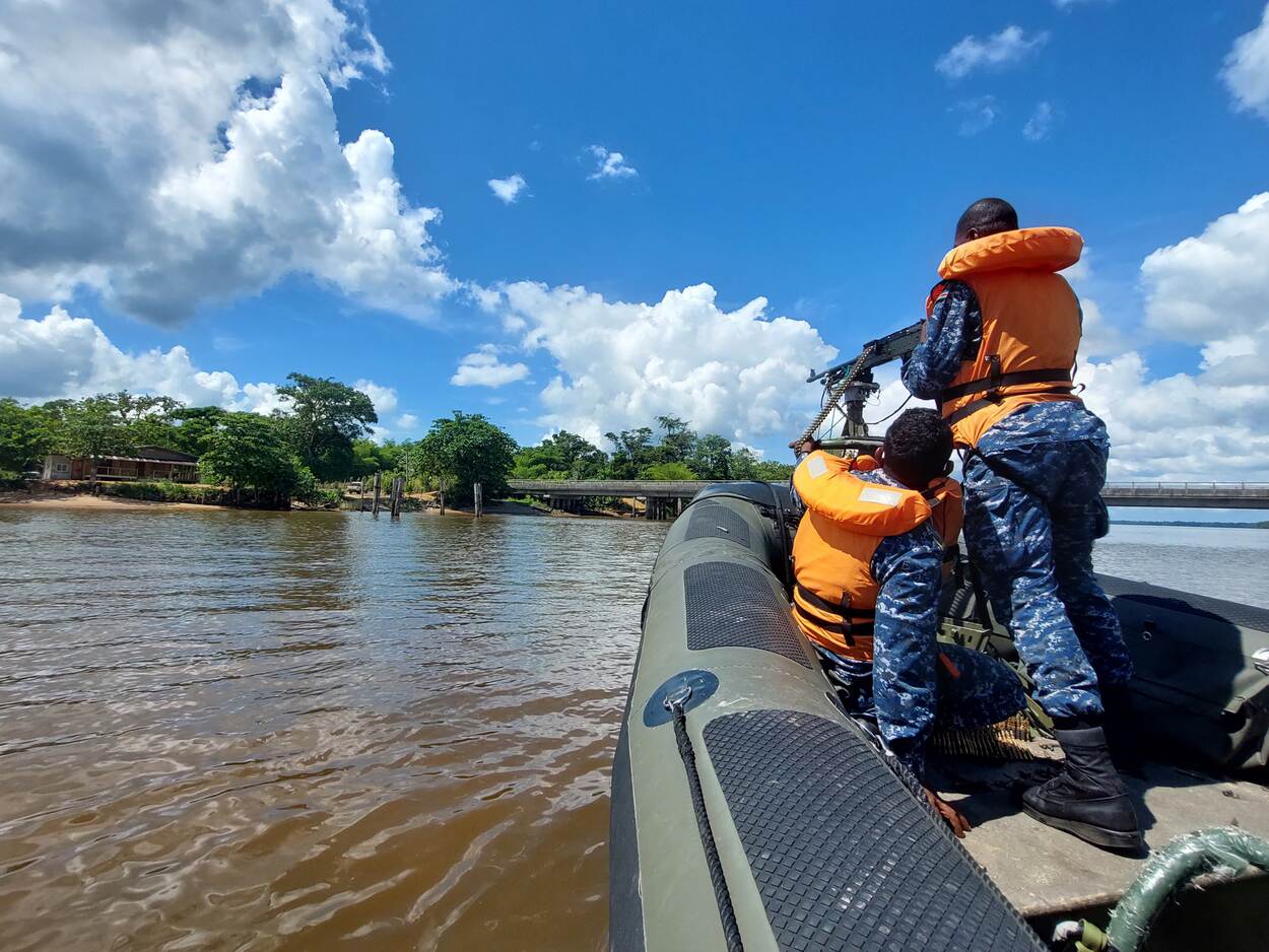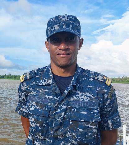 De Suriname Rivier is de uitvalsbasis van het Korps Mariniers Suriname, vertelt pelotonscommandant eerste-luitenant Pique, terwijl hij als passagier op een FRISC over de rivier scheert. “We zijn hier regelmatig te vinden. Maar boten als de FRISC’s zul je bij ons niet vinden. Wij hebben enkel kleinere patrouilleboten. Onze eenheid is nog heel jong; we zijn opgericht in 2017 en bestaan uit 3 pelotons. We voeren patrouilles uit, maar het ondersteunen van de politiedienst is ook een van onze taken. Zo patrouilleerden we in de straten tijdens de lockdown vanwege corona.”