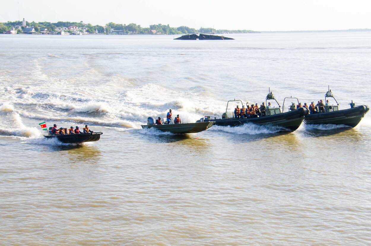 Heldere taal van de marinier van de Bootgroep van 32 Raiding Squadron. De navigator van de snelle FRISC bevindt zich midden op de Suriname Rivier, naast een tweede FRISC. Op hun vaartuigen vaart een delegatie van Surinaamse marine-infanteristen mee. Het kleine vlootverband wordt aangevuld met 1 sloep van de Surinaamse Marine, alsook 1 bootje van de Surinaamse Kustwacht. Het is het beeld van een hernieuwde kennismaking tussen beide krijgsmachten.