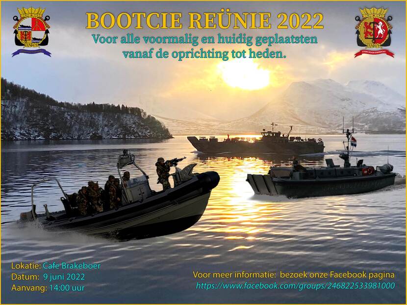 Voor iedereen die ooit geplaatst is geweest bij de Bootgroep of daar nog steeds geplaatst is, wordt op 9 juni 2022 een reünie gehouden. De locatie is café Brakeboer in Medemblik, aanvang 14.00 uur. Meer informatie op onze Facebookpagina: https://facebook.com/groups/246822533981000.