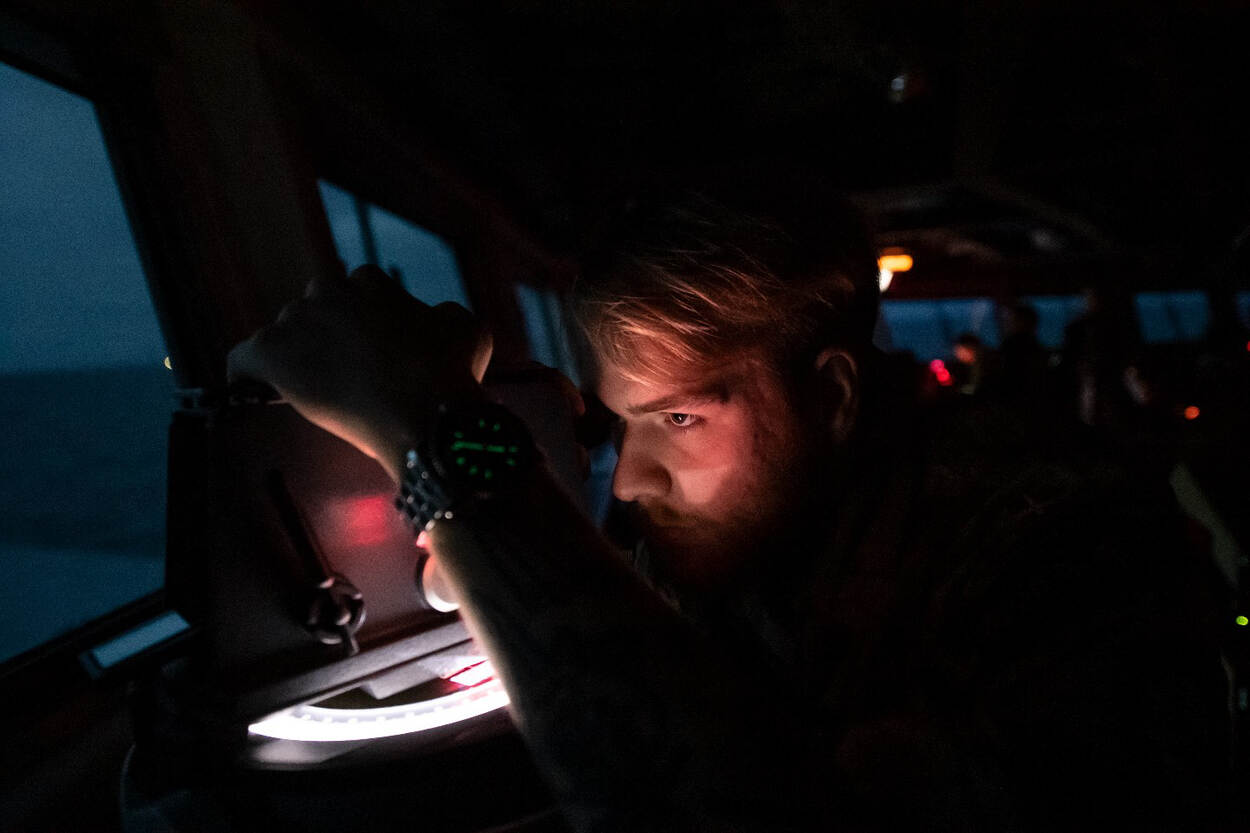 “Per schip dien je vervolgens de afstand te berekenen én hoe lang je niet opnieuw hoeft te kijken hoe dichtbij de tegenstander inmiddels is, waarna je toch nog tijd hebt om veilig weg te duiken naar 30 meter”, legt Hol uit. “Komt veel hoofdrekenen bij kijken. Voor elk naderend schip maak je die berekening. Zit je op 30 meter diepte, dan kunnen ze veilig over je heen varen. Is het schip voorbij, dan ga je snel weer terug naar periscoopdiepte en zet je je mast weer neer. Belangrijk voor je zicht en om een aanval te kunnen plaatsen. Voorafgaand aan Arctic Dolphin hadden we dit al tijdens talloze runs geoefend in de Guardion Submarine Trainer (GST) in Den Helder, met soms wel 4 schepen tegelijk. Dan houd je dus ook 5 stopwatches in de gaten. Je hebt immers ook een stopwatch nodig om tijdig een volledige ronde, ofwel allround look te kunnen maken”