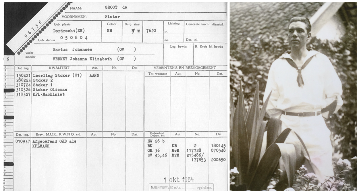 Pieter de Groot wordt op 15 augustus 1904 in Dordrecht geboren. Je kunt niet zeggen dat het leven hem meteen toelacht. Zijn vader komt nog datzelfde jaar te overlijden. Als hij 15 jaar oud is, gaat ook zijn moeder dood. Pieter kiest voor de zee en op 15 april 1921 meldt de 16 jarige zich aan bij de marine, als leerling-stoker. Hij wordt in eerste instantie geplaatst op Hr.Ms. Van Speijk, een oud stoomschroefschip dat dienstdoet als logementsvaartuig in het Nieuwe Diep. In 1924 volgt de overstap naar de Onderzeedienst, inmiddels in de rang van stoker eerste klas. De Groot heeft zich inmiddels op vrijersvoeten begeven en trouwt in datzelfde jaar met Trijntje de Croos.
