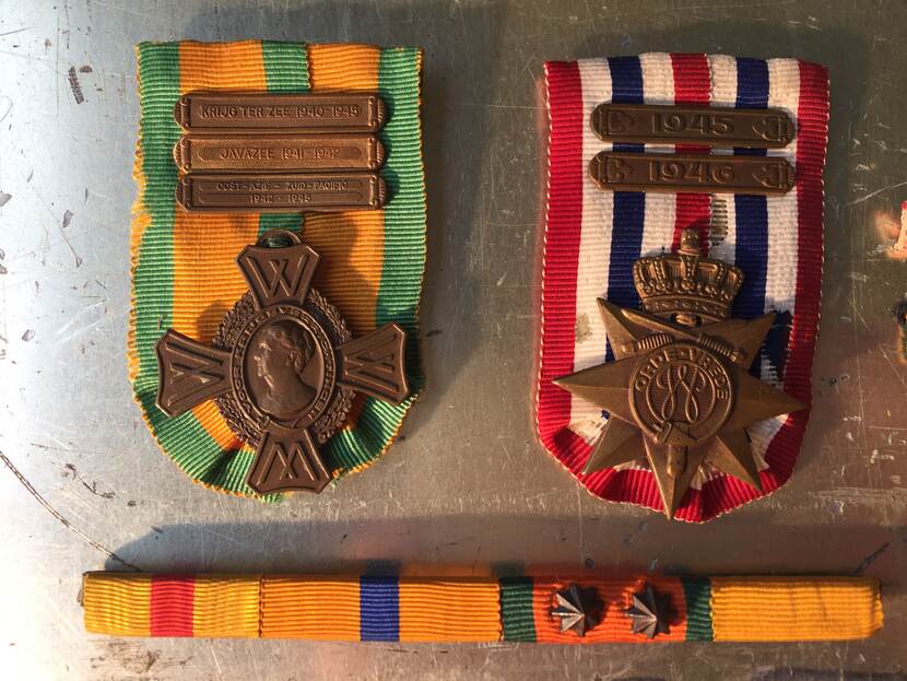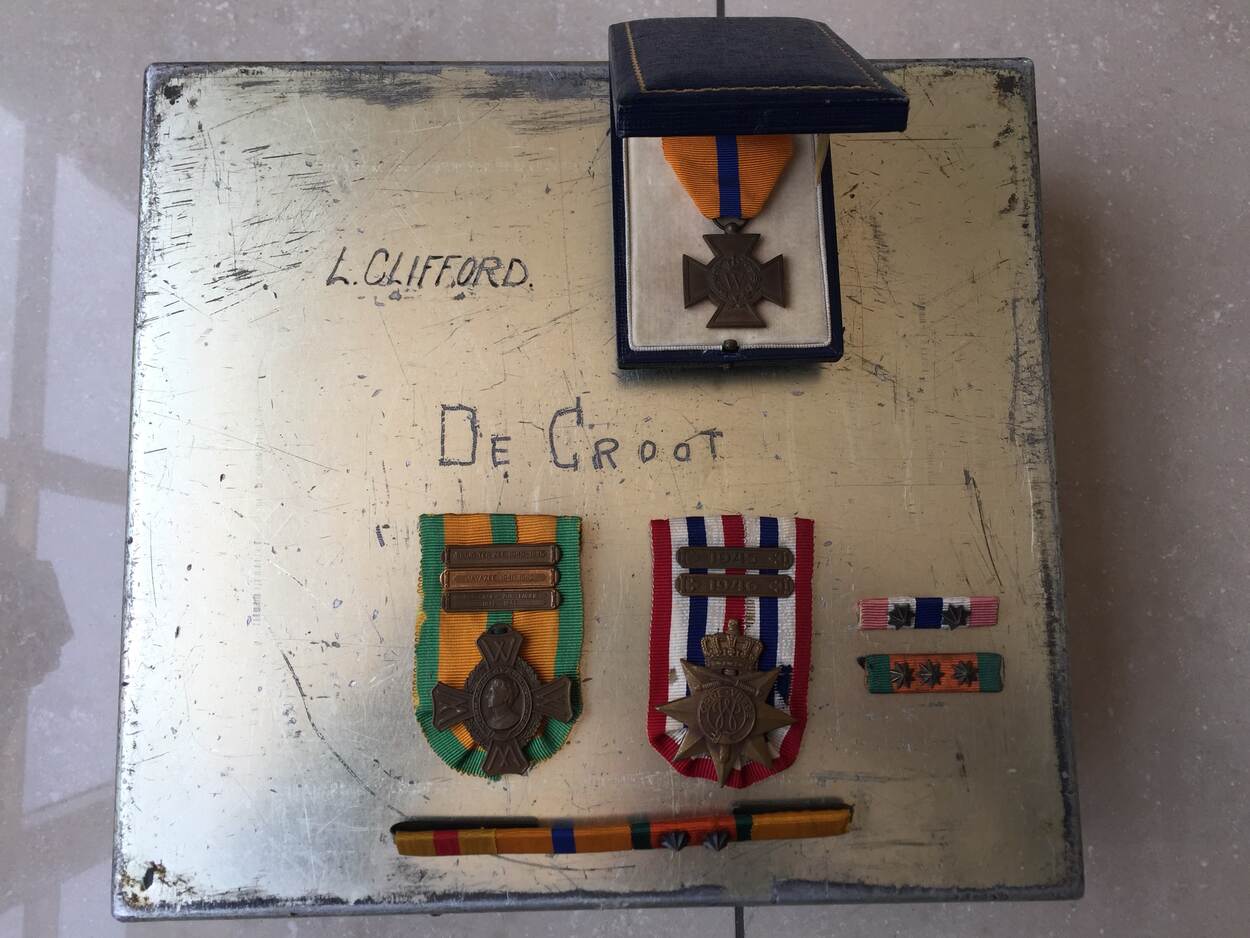 In 1947 ontving De Groot het Oorlogsherinneringskruis (l.) en in 1950 het Ereteken voor Orde & Veiligheid (r.).