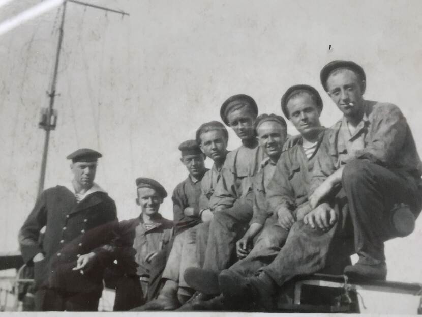 Korporaal-machinist Pieter de Groot (l.) met collega’s (datum en plaats onbekend).