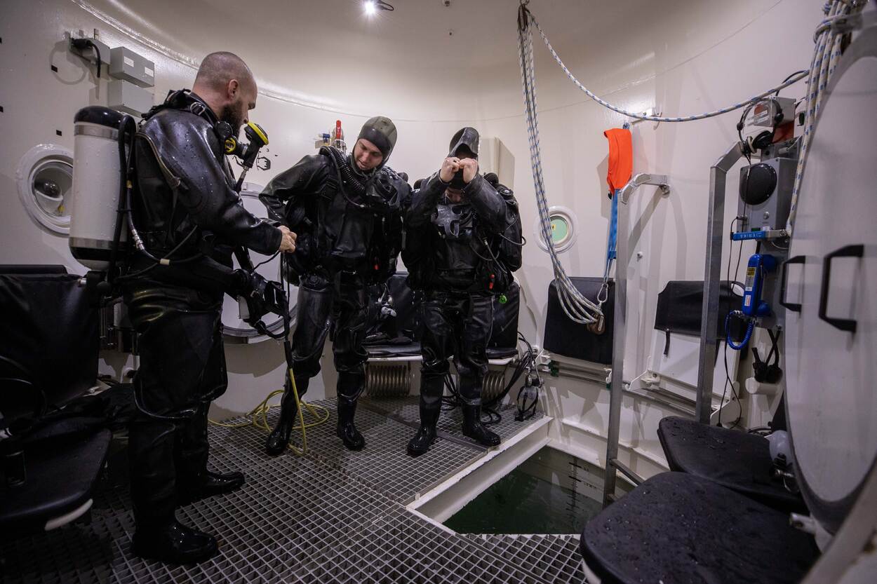 De ‘tankbedienaars’ van de Defensie Duikgroep houden vanaf een paneel alle gegevens nauwlettend in de gaten.