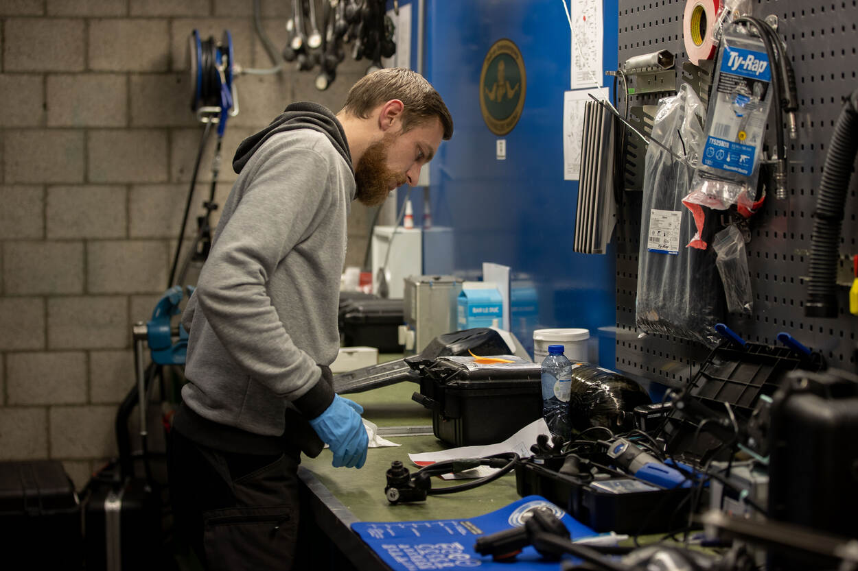 DMC-medewerker duiktechnicus Mike controleert de duiksets op storingen en lost die op.