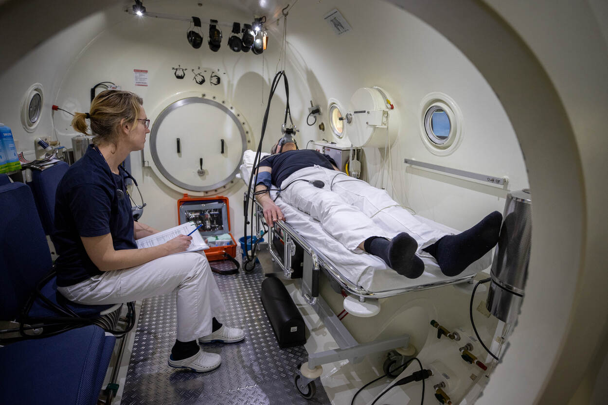 Van Ooij: “Je wordt dan met een pallet aan klachten geconfronteerd als misselijkheid, een tragere motoriek, gehoorstoornissen, slecht zien en gevoelsstoornissen. Uiteindelijk kun je invalide raken en in het extreme geval overlijden. Dat wil zeggen: als de behandeling niet op tijd plaatsvindt. Denk bij klachten niet: gaat wel over. Trek zo snel mogelijk aan de bel. Als je op tijd komt, kunnen wij in 85 procent van de gevallen decompressieziekte verhelpen. Die overige 15? Misschien kwam iemand niet tijdig bij ons of stelde dat uit. Reageerde het lichaam misschien niet optimaal? Spelen lichamelijke afwijkingen een rol? En: na een behandeling resteren soms klachten.”