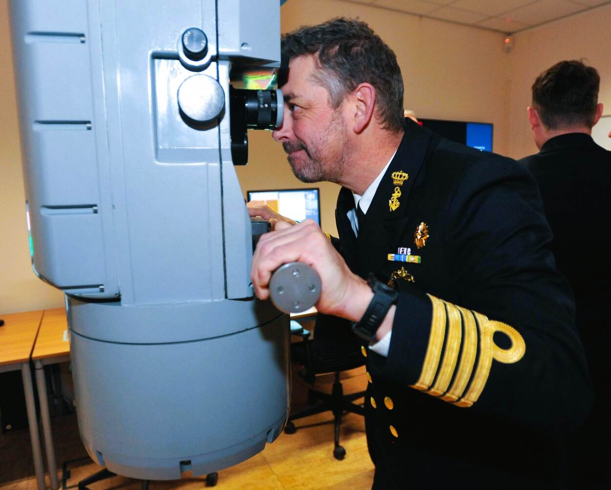 Groepscommandant Onderzeedienst KTZ Jeroen van Zanten checkt de nieuwe en zeer innovatieve periscooptrainer.