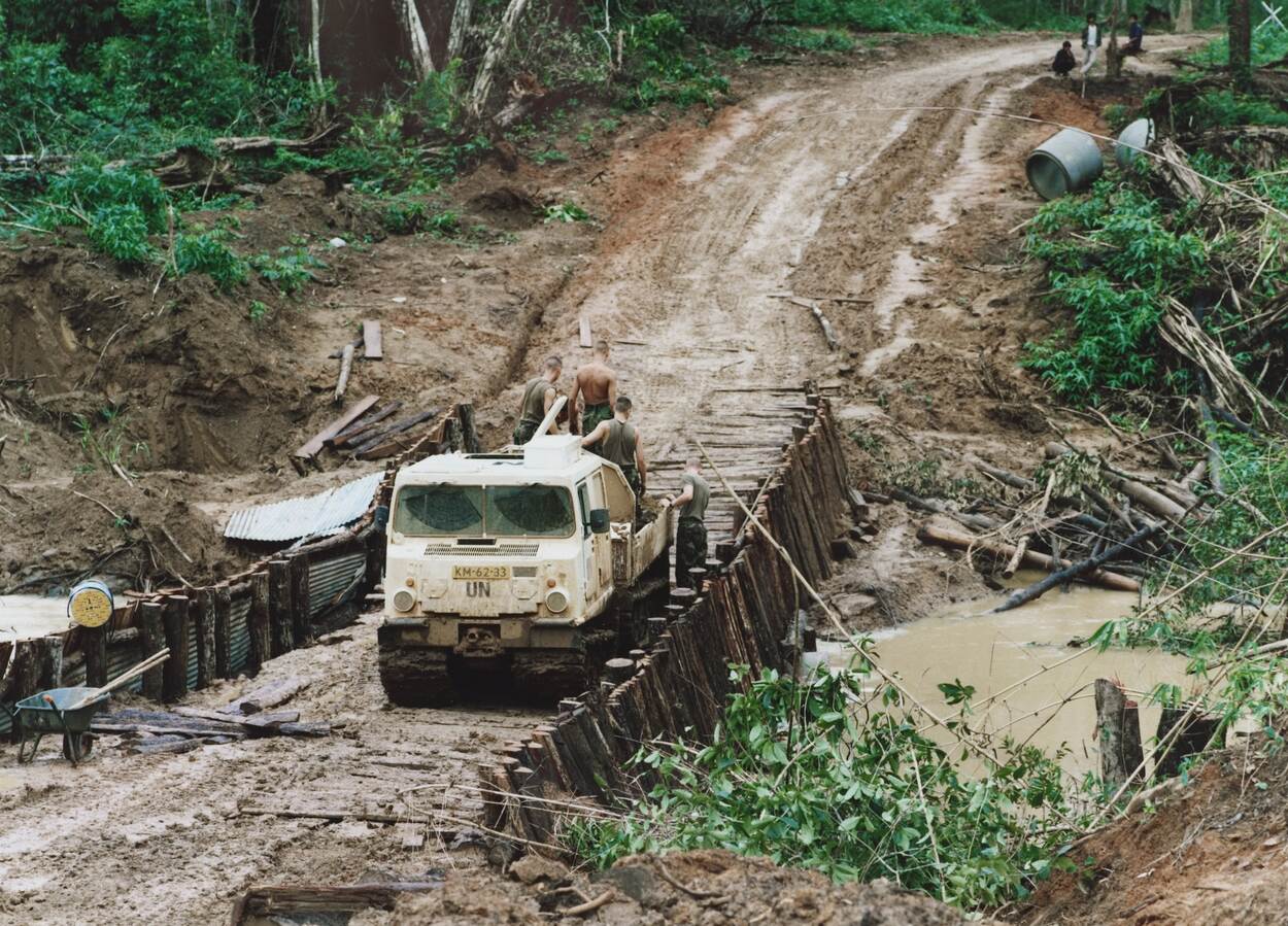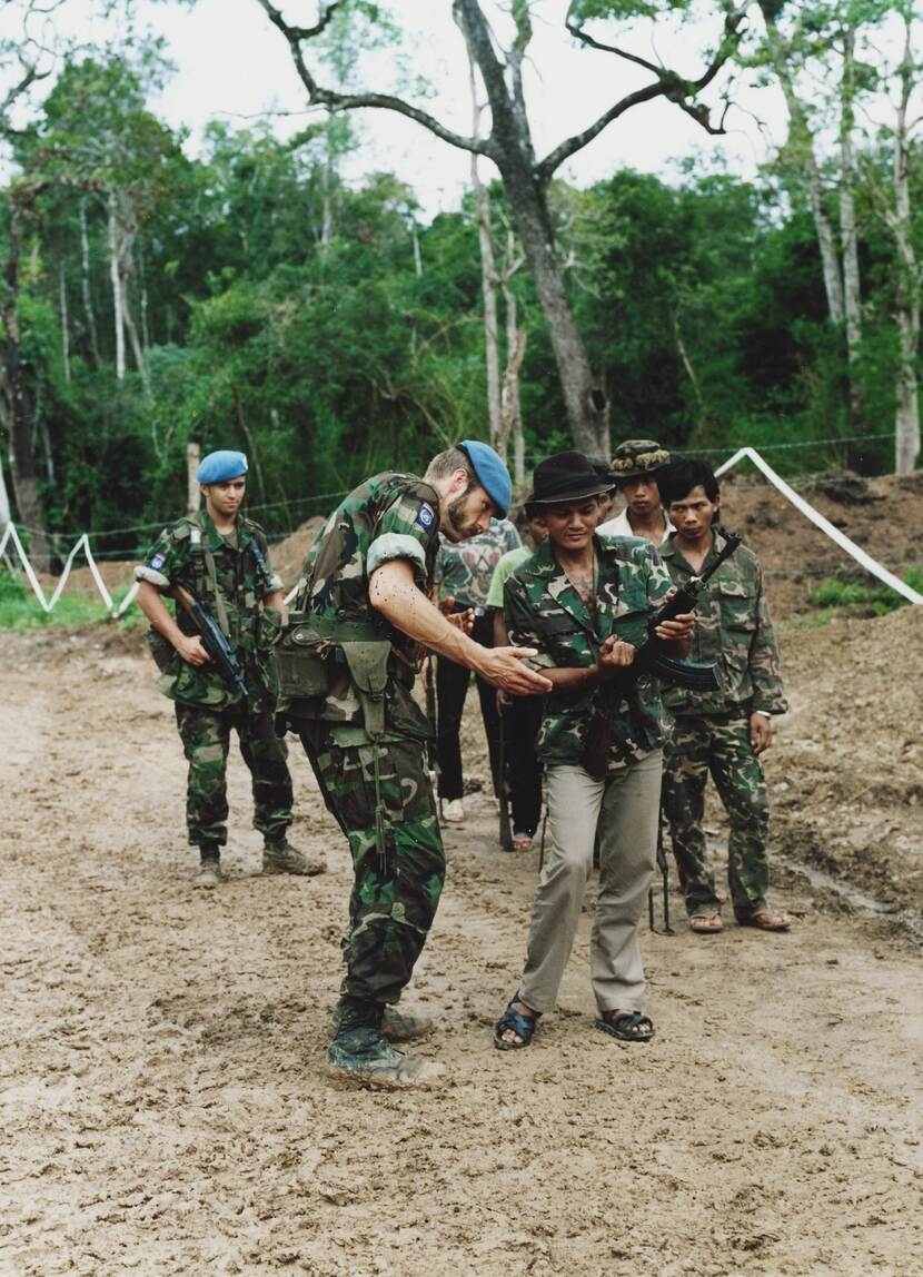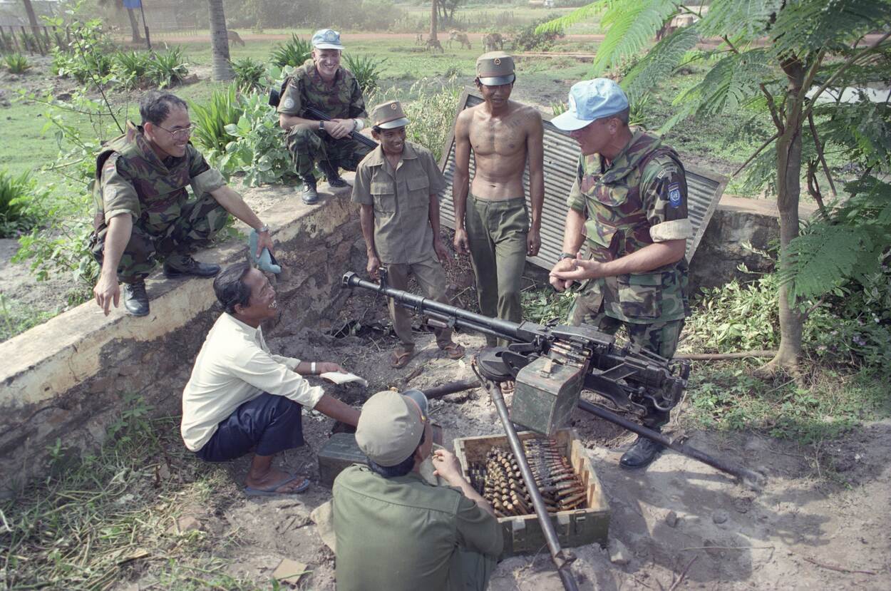“In 1992 en 1993 speelde de KM wel een hoofdrol binnen een belangrijke internationale missie”, vervolgt Van Gils. “Dat was onder VN-vlag in Cambodja. Nederland ging in eerste instantie akkoord met de deelname van 27 militairen aan de United Nations Advance Mission in Cambodia (UNAMIC). Deze missie moest het gigantische mijnenprobleem in het Aziatische land aanpakken.” UNAMIC ging al snel op in UNTAC (United Nations Transitional Authority in Cambodia). Hiervoor werd flink uitgepakt. De Nederlandse bijdrage bestond uit een versterkt bataljon van het Korps Mariniers, van ongeveer 800 personen. Zij kregen de beschikking over 3 transportvliegtuigen van het type F-27 Troopship en 3 Alouette III-helikopters, met ongeveer 70 man ondersteunend personeel.