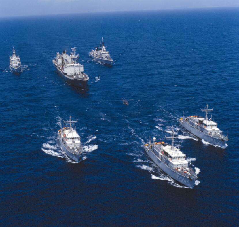 “Wel vaardigde de KM sporadisch waarnemers af voor de UNTSO-missie in het Midden-Oosten”, aldus Van Gils. Hier werd het qua Nederlandse inzet een stuk drukker toen de Nederlandse regering besloot tot het zenden van troepen voor de United Nations Interim Force in Lebanon (UNIFIL). In totaal zo’n 9.000 man van met name 44 Pantserinfanteriebataljon Regiment Infanterie Johan Willem Friso van de landmacht leverden hier tussen 1979 tot 1985 een bijdrage. “Het was niet dat de KM in die periode op zijn handen zat”, aldus de historicus, “maar er vond geen specifieke inzet voor de VN plaats. Wel stuurde de marine in internationaal verband bijvoorbeeld mijnenjagers naar de Arabische Golf, tussen 1987 en 1989, vanwege de dreiging van mijnen tijdens de Iran-Irak-oorlog (1980-1988), om de vrije doorvaart te waarborgen.”