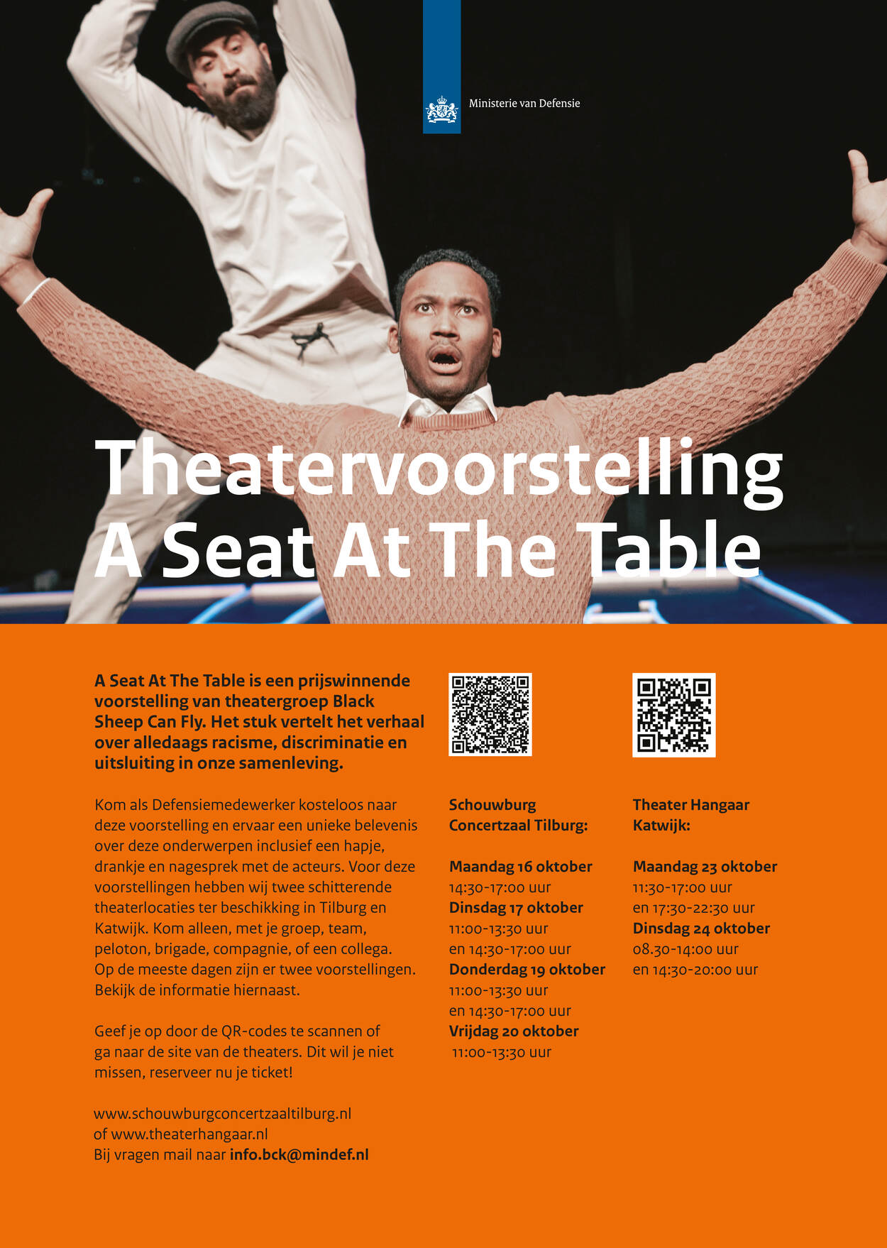 A Seat At The Table is een prijswinnende voorstelling van theatergroep Black Sheep Can Fly. Het stuk vertelt het verhaal over alledaags racisme, discriminatie en uitsluiting in onze samenleving. Klik op de poster voor meer info.