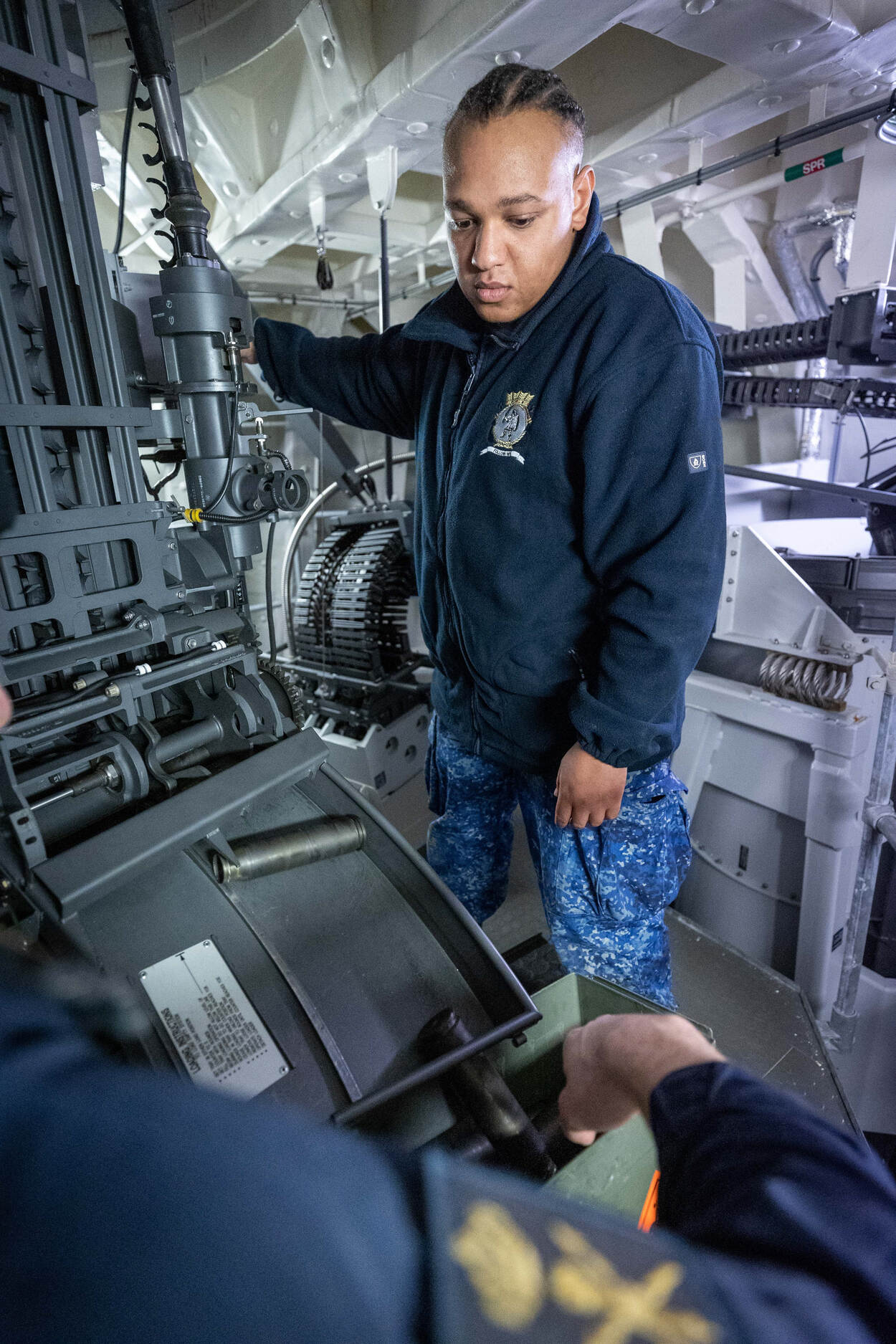 Dat lachen is mede te danken aan korporaal TD Sheldon. Sinds 2020 vervult hij de rol van wapenspecialist op het schip. Het werken met de Goalkeeper was ‘weer even inkomen’, geeft hij toe, maar uiteindelijk verliep de test met ‘het laatste redmiddel van het schip’ soepel. “Het is goed om dit weer te kunnen doen”, zegt hij met een bezweet voorhoofd. In hoog tempo halen hij en een collega de lege hulzen uit het systeem. “Als je op de knop drukt, moet alles goed gaan. En dat ging het.”