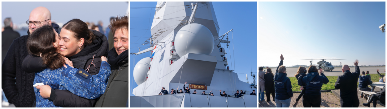 Bemanningsleden van de Tromp en de boordhelikopter zwaaien naar vrienden en familie, terwijl anderen elkaar omhelzen ten afscheid.