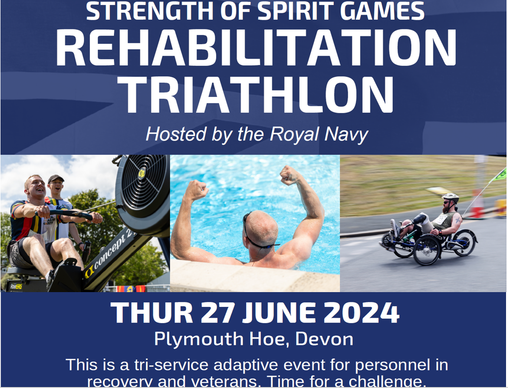 De Britse Royal Navy houdt op donderdag 27 juni 2024 een Rehabilitation Triathlon in het Zuid-Engelse Plymouth. Dit evenement is specifiek gericht op personeel dat door langdurige ziekte, blessures of verwondingen een lang rehabilitatie of re-integratie-traject achter de rug heeft. Dit geldt voor zowel mariniers als personeel van de vloot. Het doel van de Rehabilitation Triathlon is om de deelnemers te sterken in het feit dat de moeilijke periode achter de rug is, hen samen te brengen met lotgenoten en weer vertrouwen te geven in de toekomst. Ook deelnemers uit Nederland zijn welkom in Plymouth. De sporten die beoefend worden zijn: