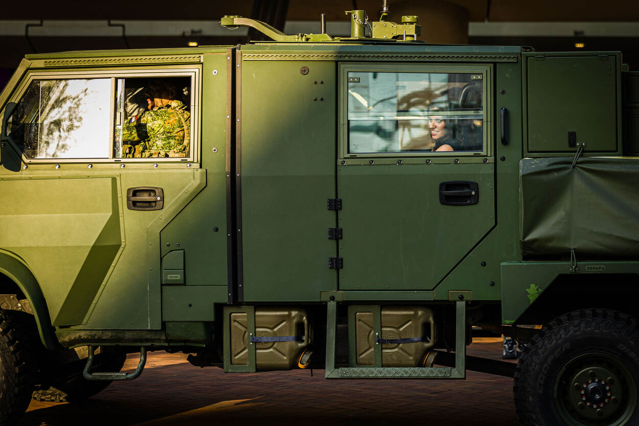 Een voertuig van het type Anaconda komt aanrijden, met actrice Ortal Vriend wuivend achter het raam.