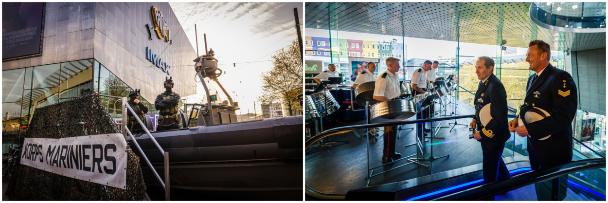 Links: Dat het Korps Mariniers aanwezig was bij de première van ‘Invasie’ was wel duidelijk. Rechts: De Steelband van het Korps Mariniers zorgde binnen voor passende Caribische klanken.