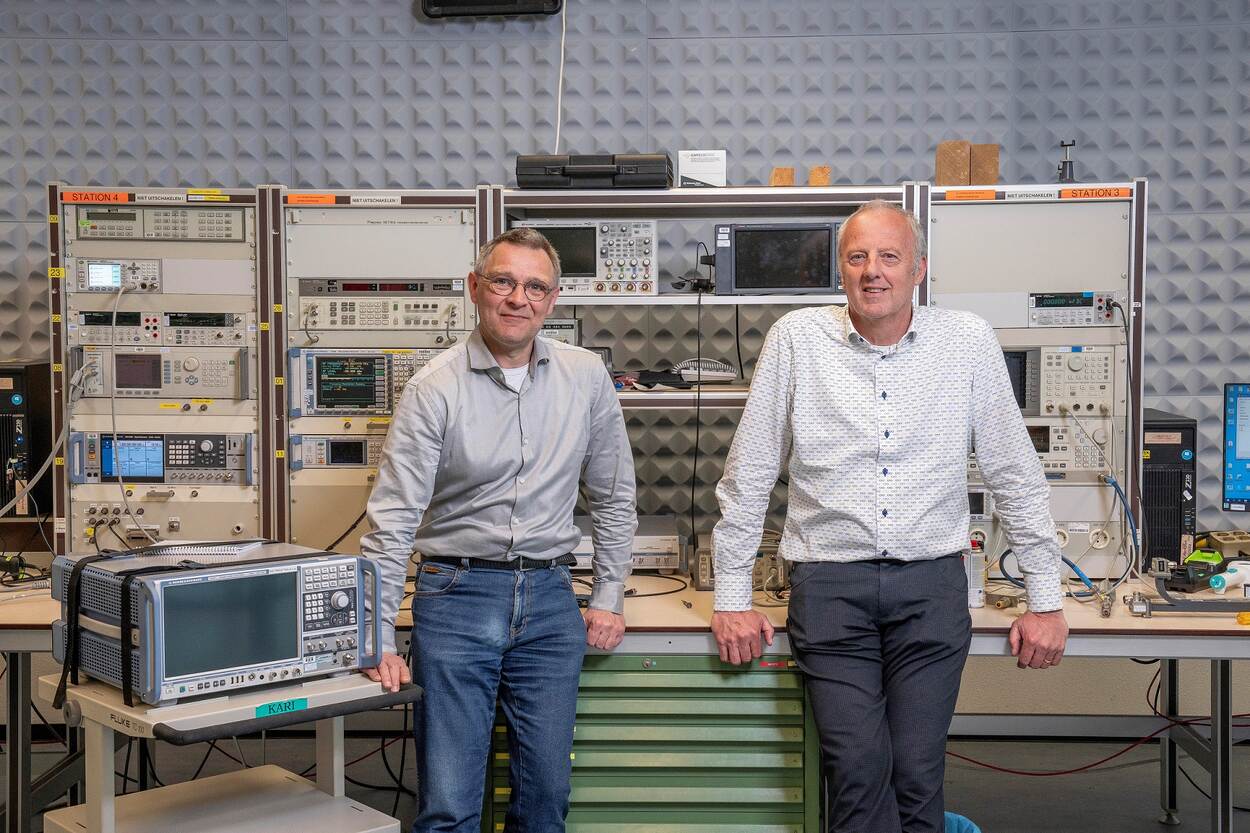 Alfred Neefjes (l.) en Frank Dreef staan bij een microgolf-teststation, waarmee onderdelen van radarinstallaties en zenders worden gekalibreerd.