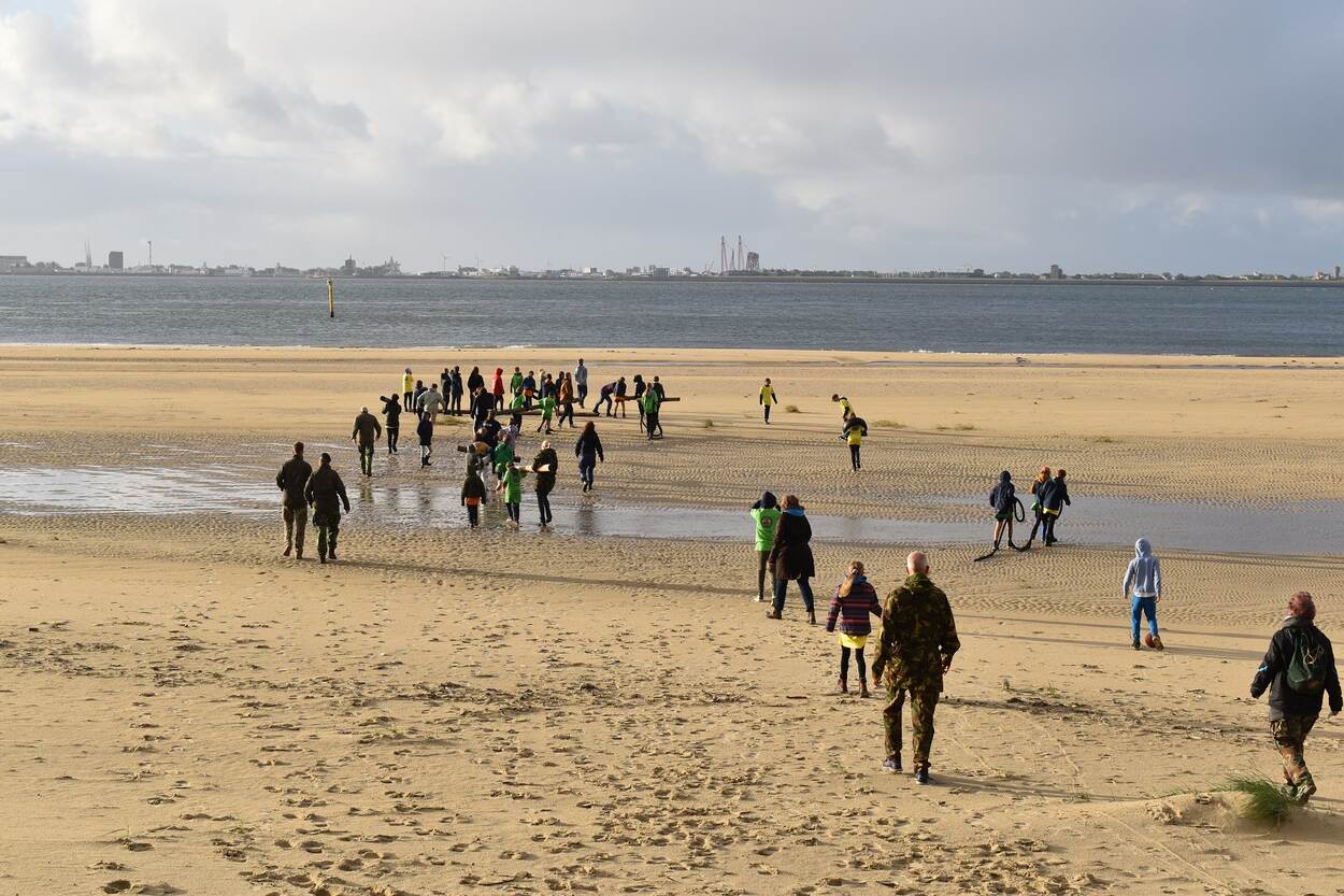 Kinderen en begeleiders verlaten het strand met balken in hun handen.