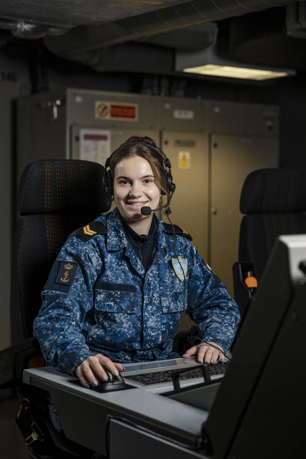 Middenin het schip houdt zij het lucht- en zeebeeld nauwlettend in de gaten. Dat doet ze op enkele van de vele schermen in de Commandocentrale. De data net controller geeft aan de collega’s verderop in het eskader door wat ze daarop ziet. “Vergelijk het met een WhatsApp-groep waar meerdere schepen aan deelnemen. Daarin kunnen we het tactische plaatje met elkaar delen. Bijvoorbeeld rond andere schepen of mogelijke tegenstanders die we zien.”