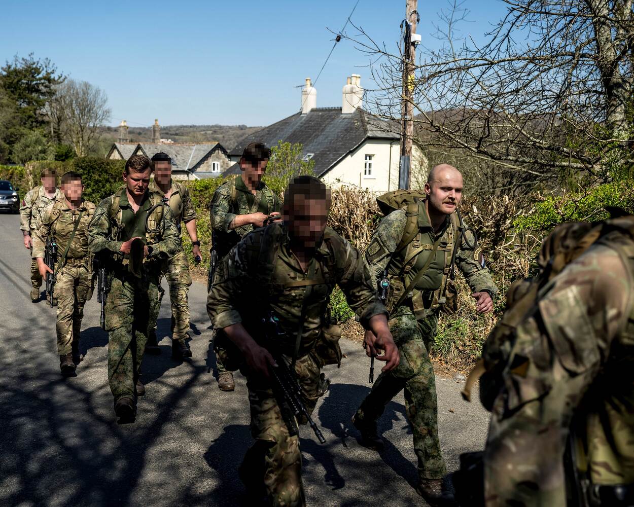 Marine commandos-in-spe lopen over een Brits landweggetje.