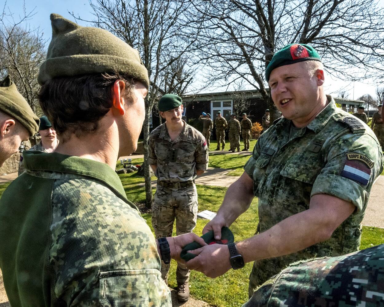 Luitenant-kolonel der mariniers Bert Odding reikt een marinier de groene baret uit.