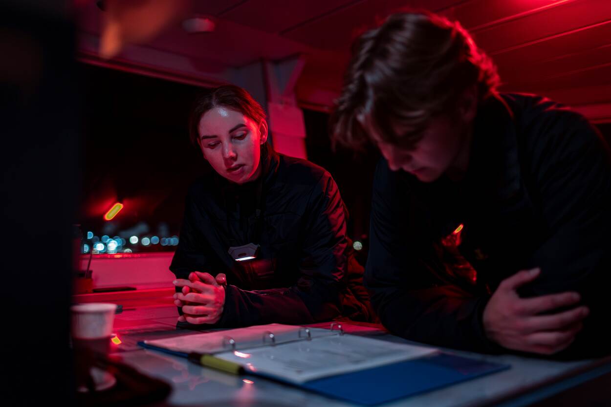 Aan boord staan de 8 adelborsten van Klas 24 C onder hoogspanning. Met witte gezichtjes van de slaap verdiepen ze zich op de navigatiebrug in het gebruik van onder meer de radar, de ECDIS-elektronische zeekaart, de VHF-radio, in hoe je een verkeersroute afvaart en in de Bepalingen ter Voorkoming van Aanvaringen op zee. Dit alles gebeurt onder toeziend oog van de 3 instructeurs van de Maritieme Trainings Faciliteit (MTF), onderdeel van het Koninklijk Instituut voor de Marine (KIM). Samen monitoren en beoordelen ze onophoudelijk de verrichtingen van de adelborsten.