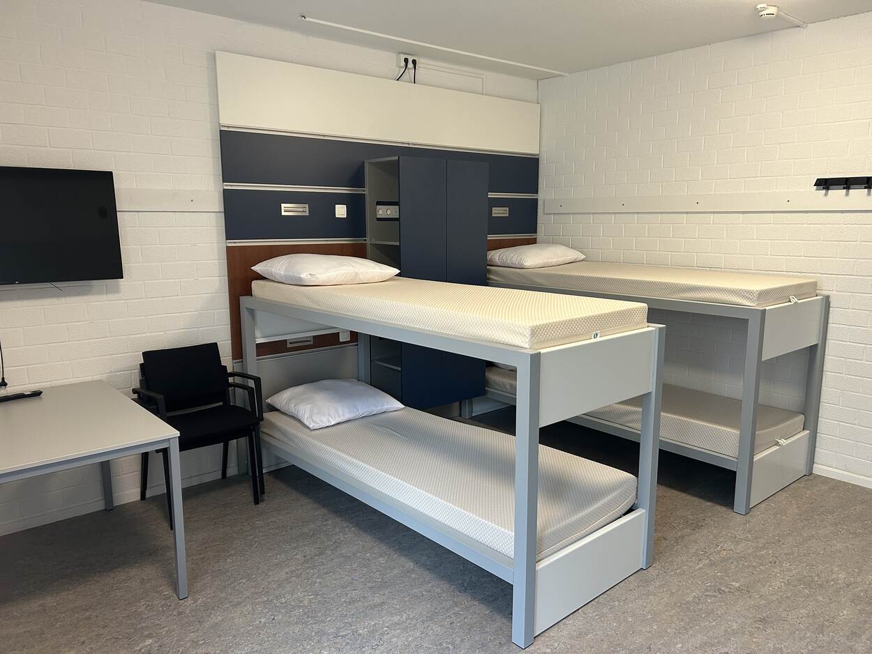 2 stapelbedden naast elkaar met daarnaast een stoel en een tv.
