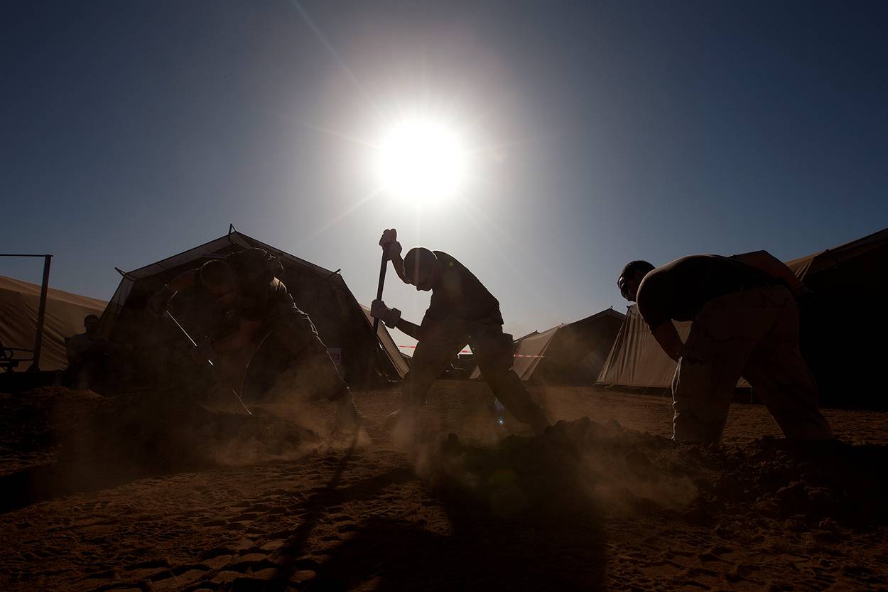 En improviseren moeten ze. Tot dusver beschikken de genisten pas over vier bouwmachines en drie trucks. Het overige materiaal kan ieder moment aankomen. “Ik heb een goed team en volgende week krijgen we versterking vanuit Nederland. Dan is het wachten op het zware materieel dat we nodig hebben om het terrein bouwrijp te maken”, aldus Janssen. “Verder passen we ons werk en schema aan waar we kunnen.”