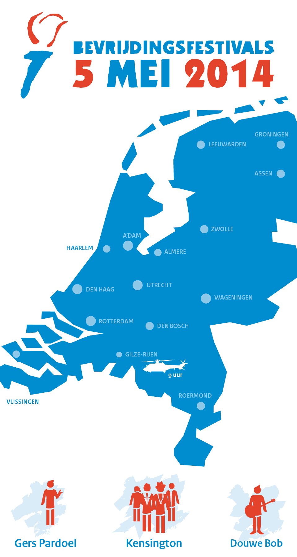 Vrijheidambassadeurs Kensington, Gers Pardoel en Douwe Bob vlogen 5 mei met de luchtmachthelikopters door het land. Check de infographic waar ze allemaal kwamen.