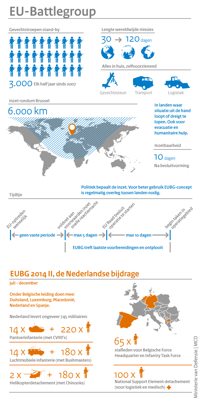 Eenheden van de Koninklijke Landmacht en Koninklijke Luchtmacht staan vanaf 1 juli een half jaar paraat om namens de Europese Unie ingezet te worden. Wanneer en waar ook ter wereld: de EU-Battlegroup is de snelle reactiemacht van de EU en NAVO.