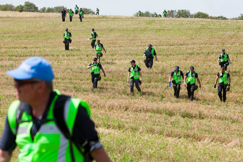 Krakende takken verraden waar de gecombineerde teams van Nederlanders, Australiërs en Maleisiërs zich op de crash site bevinden. Op linie kammen ze bossen, maïsvelden, volkstuintjes en weilanden uit. Forensisch onderzoekers, marechaussees, politieagenten met en zonder speurhond. Allen hebben hetzelfde doel voor ogen: stoffelijke resten en persoonlijke eigendommen verzamelen en die zo snel mogelijk teruggeven aan de nabestaanden. Makkelijk is dat werk niet. “De oorlog is dichterbij dan je denkt”, merkt opperwachtmeester Holt op, nadat een serie doffe explosies nabij het dorp Petropavlivka klinkt. Hij zit tegen een boom en wacht tot hij het veld weer in mag. Nu is het te gevaarlijk. “Onderweg van Soledar (waar de staf de operatie aanstuurt, red.) naar de crash site zag ik al dat er veel bedrijvigheid was en de Oekraïense stellingen verschoven waren. Toen we even stil stonden, hoorden we hevige knallen.”
