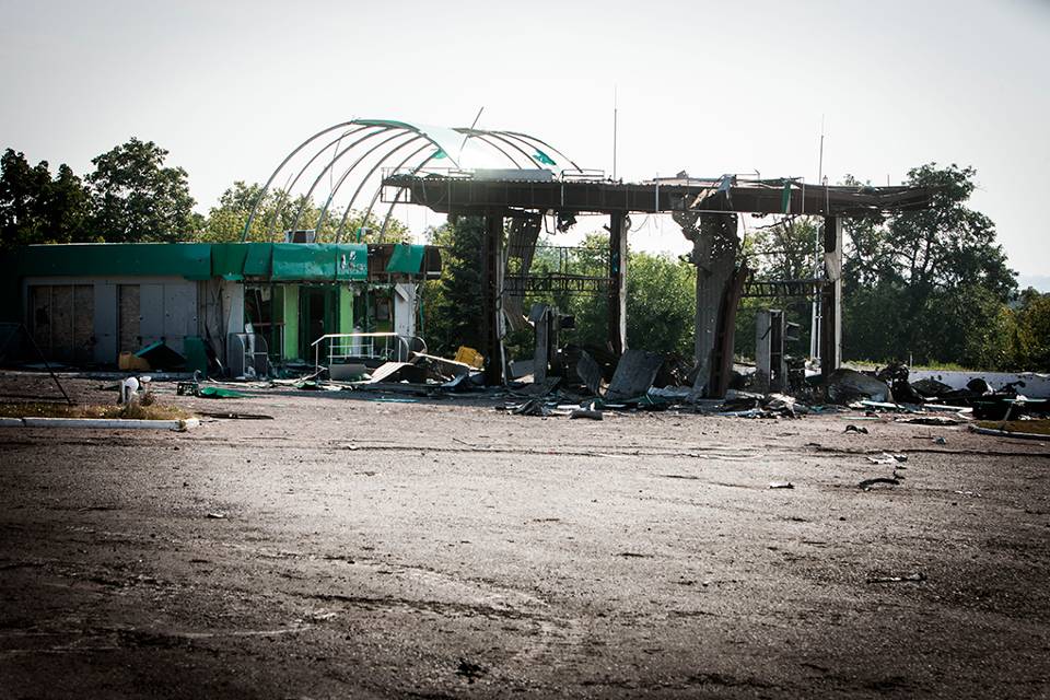 De weg naar de rampplek is niet altijd goed begaanbaar. Zo rijdt het konvooi met moeite over een brug die gedeeltelijk is vernietigd. Verderop boorde een blindganger zich in het asfalt. Overal op straat liggen kogelhulzen. Kraters in weilanden bewijzen dat lang niet alle mortiergranaten hun doel troffen. Verderop staat het Oekraïense leger met zwaar geschut op de route van de crash site. Tanks, pantservoertuigen, machinegeweren. Een finaal verpulverd benzinestation verderop is de stille getuige van de hevige gevechten.