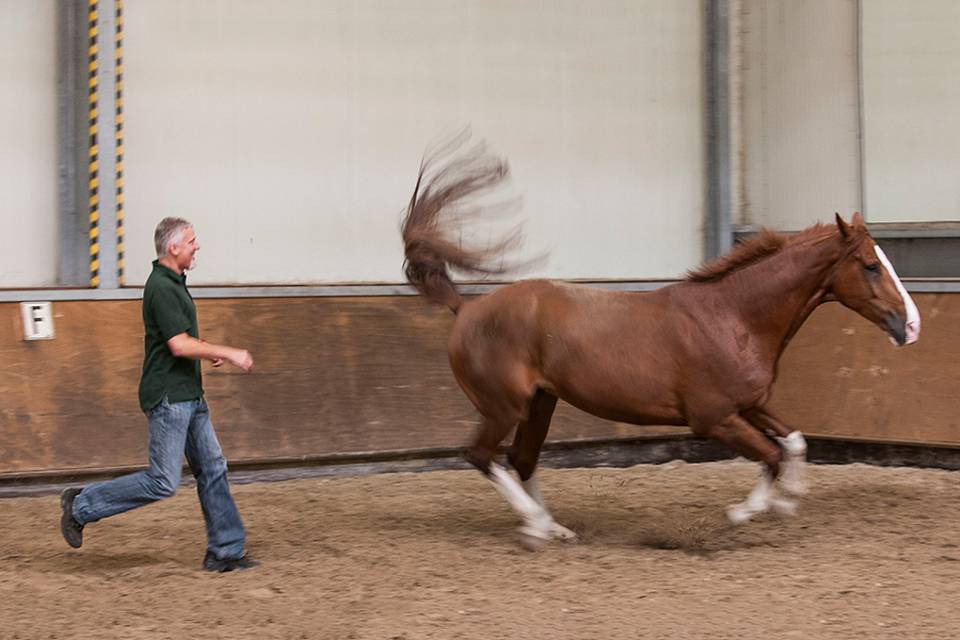 Denk niet aan geblinddoekt rijden of halsbrekende sprongen. Het concept is simpel. Een handjevol officieren, veelal zonder ervaring met paarden, gaat één voor één de confrontatie aan met het edele dier. Houding, lichaamstaal en ‘energie’ zijn het enige waarmee zij het paard moeten laten doen wat zij willen. “Paarden spiegelen heel puur”, vertelt korporaal 1 Angela Kalkman, plaatsvervangend bedrijfsleidster op de manege van het Korps Rijdende Artillerie. “Straal jij rust en zelfvertrouwen uit en blijf je consequent, dan zal het paard je eerder als leider accepteren.”