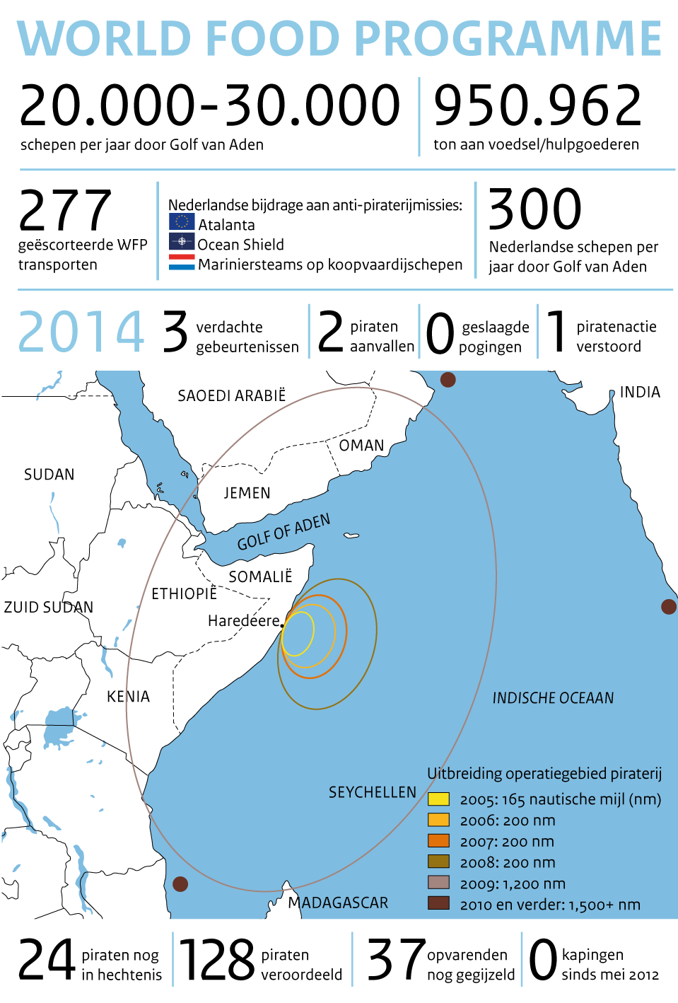 Graan, olie, maïs en soja kwamen dankzij een escorte van Zr.Ms. Zeven Provinciën deze maand veilig aan in Somalië. Piraterij is in de Golf van Aden nog steeds een reële dreiging. Marineschepen van de Europese Unie en de NAVO zorgen ervoor het World Food Programme haar humanitaire hulp veilig kan afleveren voor de hulpbehoevende Somaliërs. Nederland levert daaraan direct en indirect een belangrijke bijdrage.