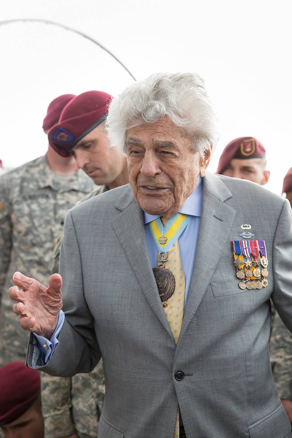 De 97-jarige veteraan Megellas was niet onder de indruk van de CV90-pantservoertuigen en grondtroepen die de Waaloverstekers ‘onder vuur’ namen. “It’s my fifth time, so…”, lachte de Texaan.