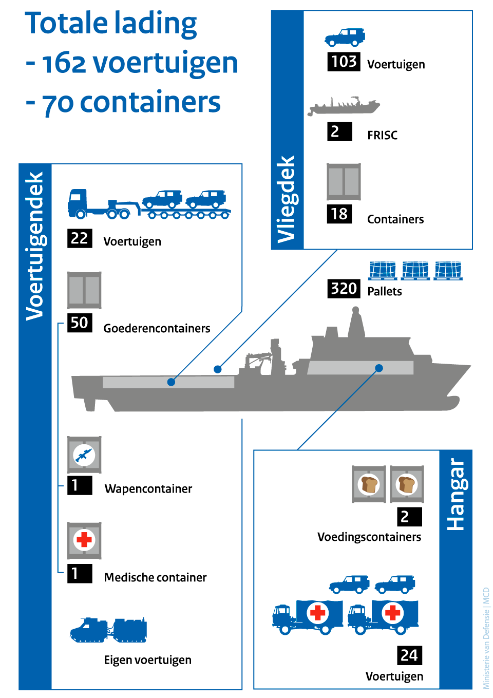 Minister Hennis: “De vraag is nadrukkelijk om transport van hulpgoederen te regelen. De Karel Doorman is hiervoor bij uitstek geschikt.” Het grootste en nieuwste marineschip bezit faciliteiten als helikopterdecks, grote laadvloeren en logistieke middelen.