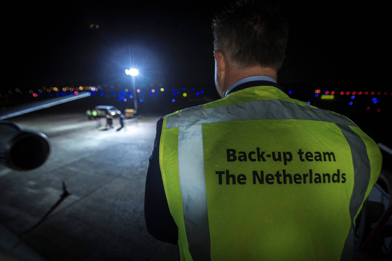 Niet dat dit de druk van de schouders van de marechaussee haalt. “Het is een Nederlandse vlucht, volgens Nederlandse regels”, maakt Jethro duidelijk. De humane behandeling van de uit te zetten vreemdeling staat daarin voorop en daar letten ze continu op. Behalve de 10 begeleiders levert de marechaussee ook een back-up team. Die ploeg van ervaren begeleiders komt in actie wanneer Nederlandse of buitenlandse collega’s hun vreemdelingen niet in bedwang weten te houden. Belangrijk, zeker wanneer zoals op deze vlucht nagenoeg alle stoelen zijn bezet.