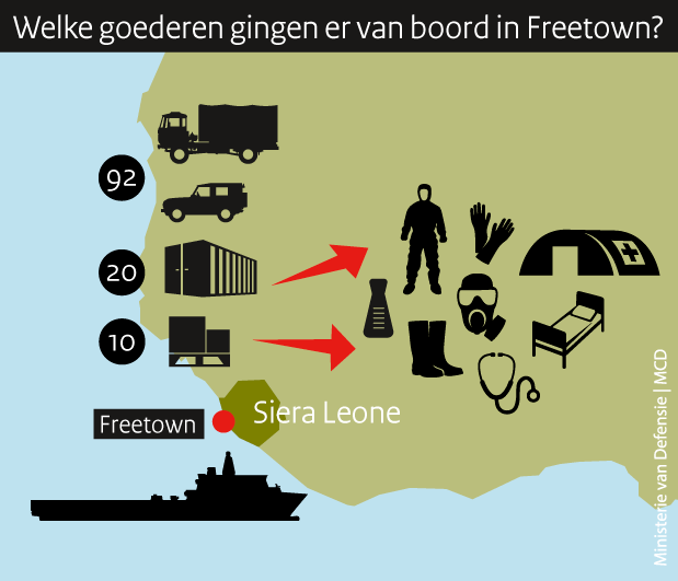 De kust van Sierra Leone komt dinsdagochtend letterlijk in beeld. Vanaf de dekken aan stuurboordzijde ziet de bemanning van het schip de haven van Freetown mooi liggen. Vliegvissen scheren rakelings over het water. De laagstaande zon is zelfs vroeg in de ochtend al krachtig. Een korporaal die het laatste nieuws heeft, vertelt dat het hoogtepunt van de epidemie op het land voor zich nog niet eens is bereikt. Reden genoeg om de kostbare lading zo snel mogelijk in West-Afrika te krijgen.