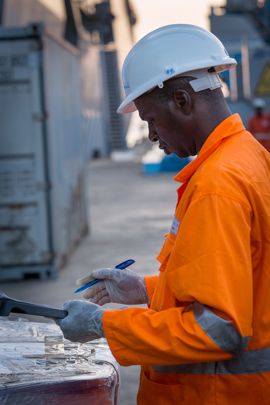 Woensdag losdag. Als de enorme achterklep contact maakt met Afrikaanse bodem, rollen 92 voertuigen een voor een het schip af. Daarnaast vinden 20 containers en 10 pallets een plek op de kade. Vanaf het helikopterdek houdt korporaal Melvin Winkelman de omgeving nauwlettend in de gaten. “Het voelt goed om hier te helpen”, vertelt de marinier terwijl hij tegelijkertijd zijn radio probeert uit te luisteren. “Ik had trouwens niet gedacht dat het lossen zo vlot zou gaan.”