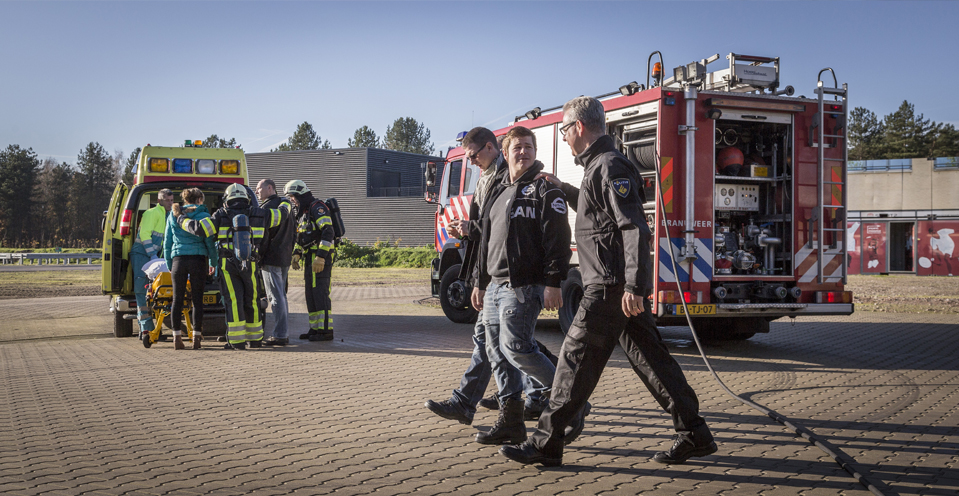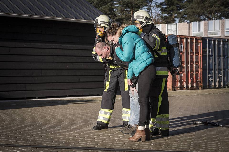 Twee ‘slachtoffers’ worden door de brandweer gered en naar buiten geleid. De ambulance staat inmiddels al klaar.