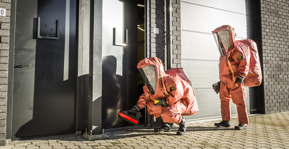 Na een melding dat er mogelijk gevaarlijke stoffen in het pand zijn aangetroffen, maakt personeel van de CBRN-response eenheid zich klaar om naar binnen te gaan en metingen te verrichten.