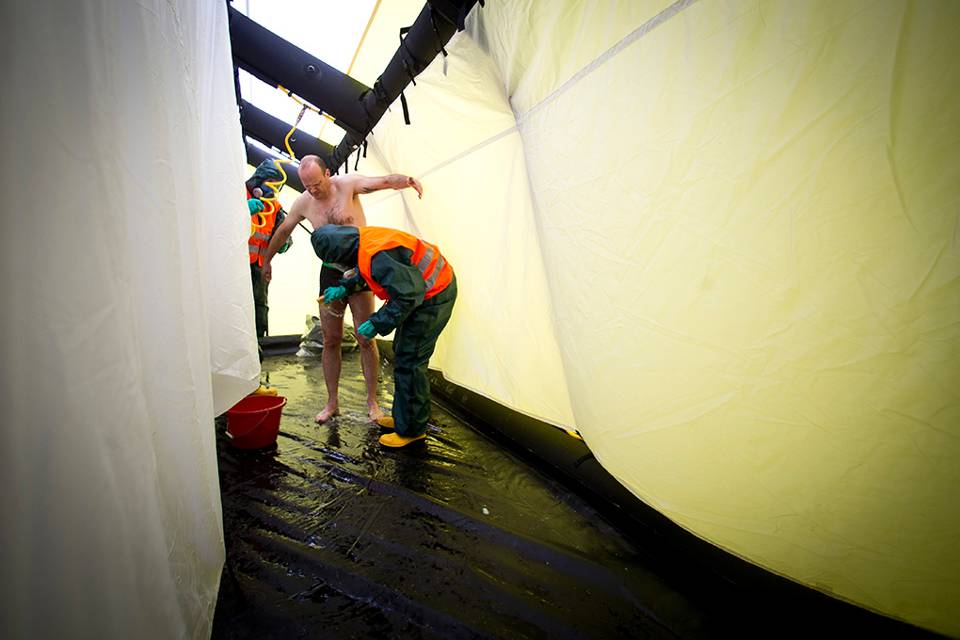 De CBRN-response eenheid beschikt over faciliteiten om personeel en ‘slachtoffers’ te ontsmetten na, bijvoorbeeld, een gasaanval.