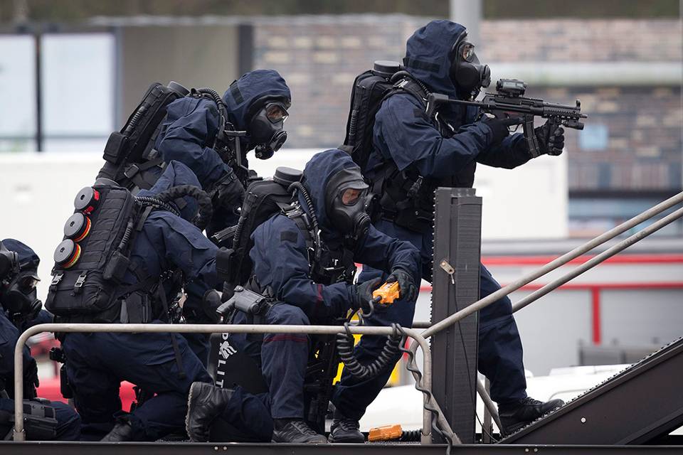 Met behulp van een ‘ladderwagen’ en een politiehelikopter bestormen verschillende teams van de DSI het pand waar ‘terroristen’ twee gijzelaars gevangen houden.