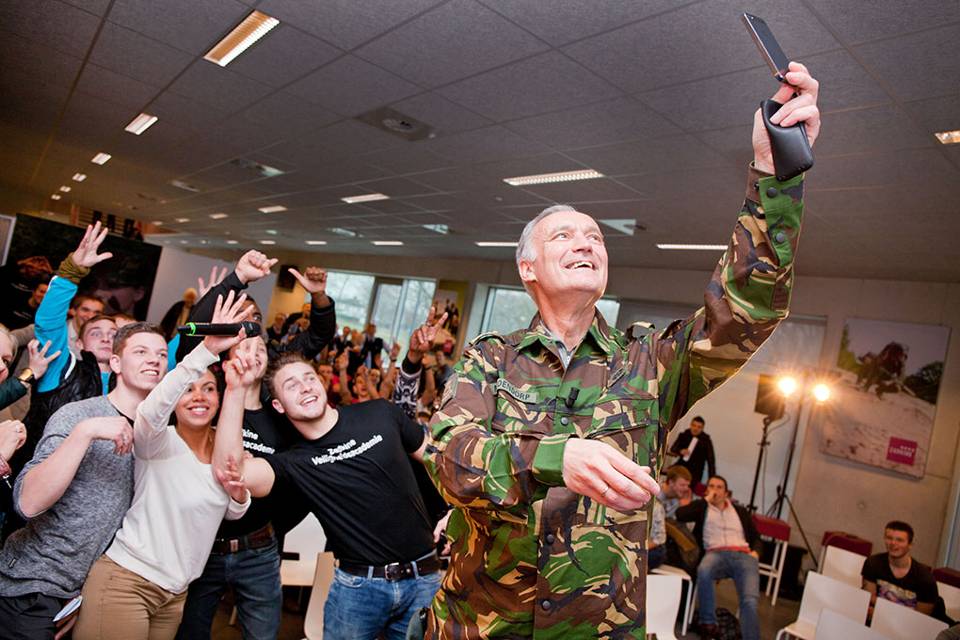 Generaal Tom Middendorp, de Commandant der Strijdkrachten, rondde onlangs een tour langs scholen van de VMBO-opleiding Veiligheid- en Vakmanschap af met een lunch met aspirant-militairen. Tijdens zijn rondgang langs de scholen werd hij vaak als een beroemdheid ontvangen. En wat doe je met idolen? Daar maak je een selfie mee. Daar was de generaal gelukkig zelf ook wel voor in.