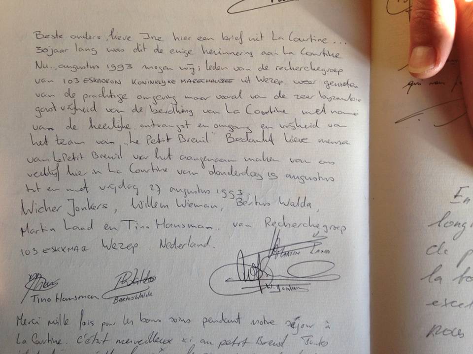 Uit het gastenboek van Au Petit Breuil in La Courtine. Bertus Walda is als enige nog in dienst bij de marechaussee. De adjudant gaat deze week met pensioen.